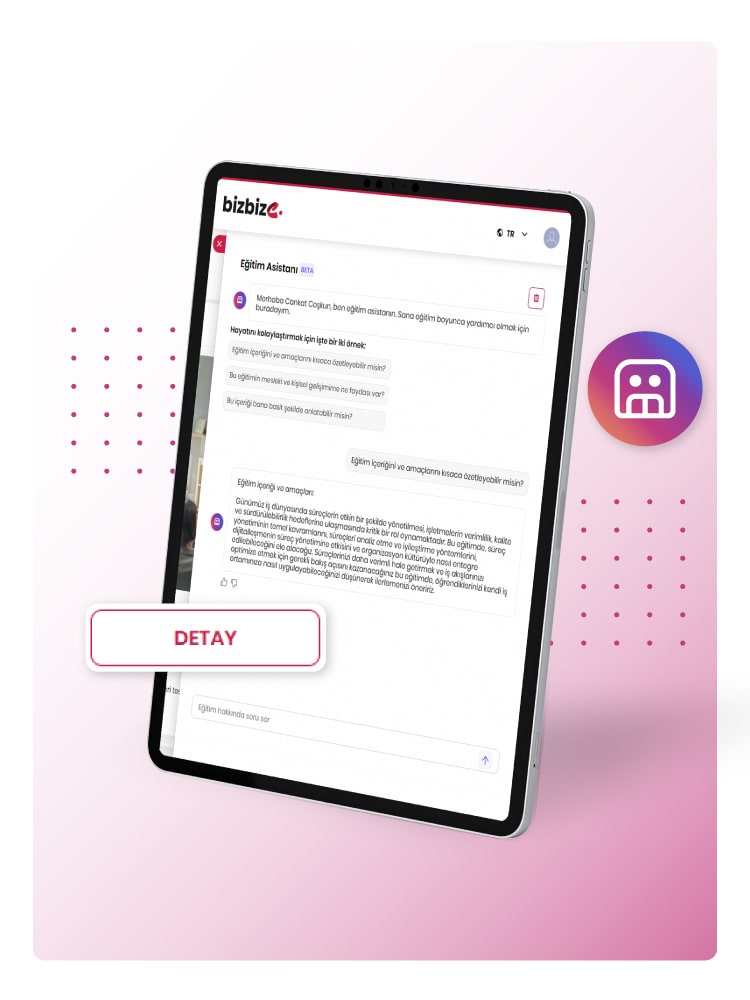 Enocta Platform üzerinde çalışan Eğitim Asistanı, izlenen eğitimle ilgili tüm sorulara anında yanıt verir; 7/24 gerçek zamanlı destek sunar, etkileşimi artırır ve bilgiyi iş hayatına taşımayı kolaylaştırır.
