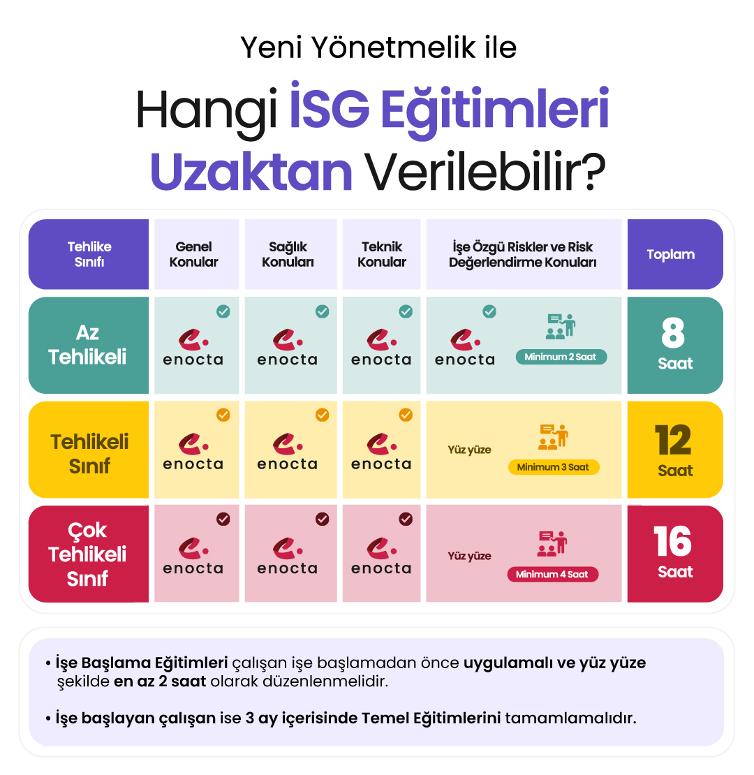 2 Nisan 2026 tarihinde yayımlanan “Çalışanların İş Sağlığı ve Güvenliği Eğitimlerinin Usul ve Esasları Hakkında Yönetmelik” ile, İSG Temel Eğitimlerinin büyük bir kısmının uzaktan eğitimle verilmesi yeniden mümkün hale geldi.