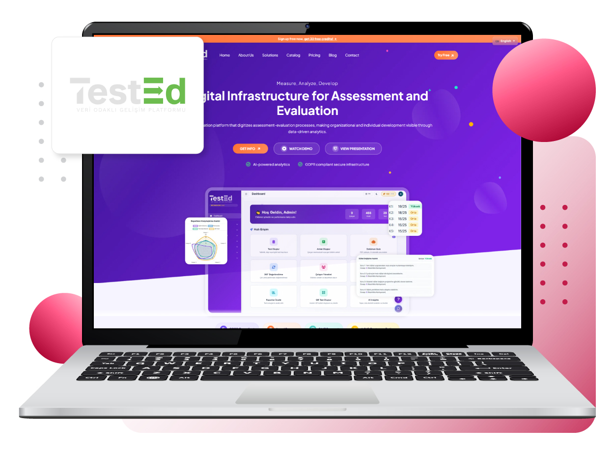 TestEd, kurumların ölçme, değerlendirme ve gelişim süreçlerini tek bir platformda birleştiren yapay zekâ destekli bir değerlendirme ve analitik çözümüdür. Eğitim yatırımlarının geri dönüşünü ölçmeyi, yetenek potansiyelini analiz etmeyi ve performans kararlarını objektif verilerle desteklemeyi mümkün kılar.